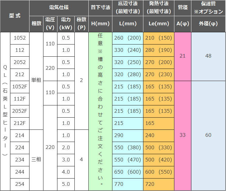 ※L型ヒーターの塩ビ保護管は後装着できません。ご注文時に必ずご指示ください。